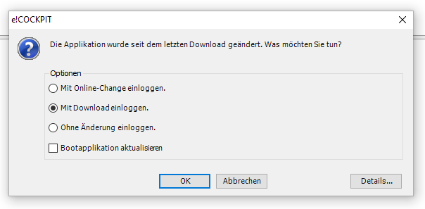 If you are asked for the options on how to download your program to the PLC, please select ``login with download```