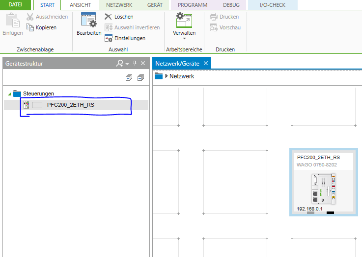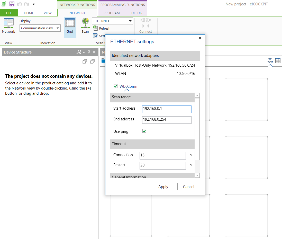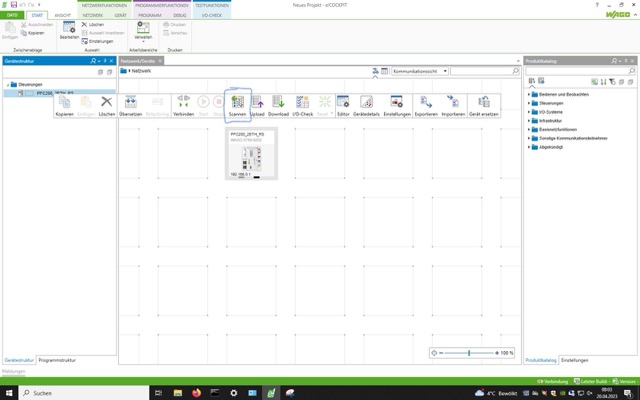Scan for and connect to the PLC from inside e!Cockpit. This is how to do it: Take a look at the PLC rack and read the PLC's IP address. Navigate to Network - Settings and put in the right IP range to scan. For example, scanning in the range from 192.168.1.1 till 192.168.1.254 will detect all PLC's in this network that have IP addresses within that range.