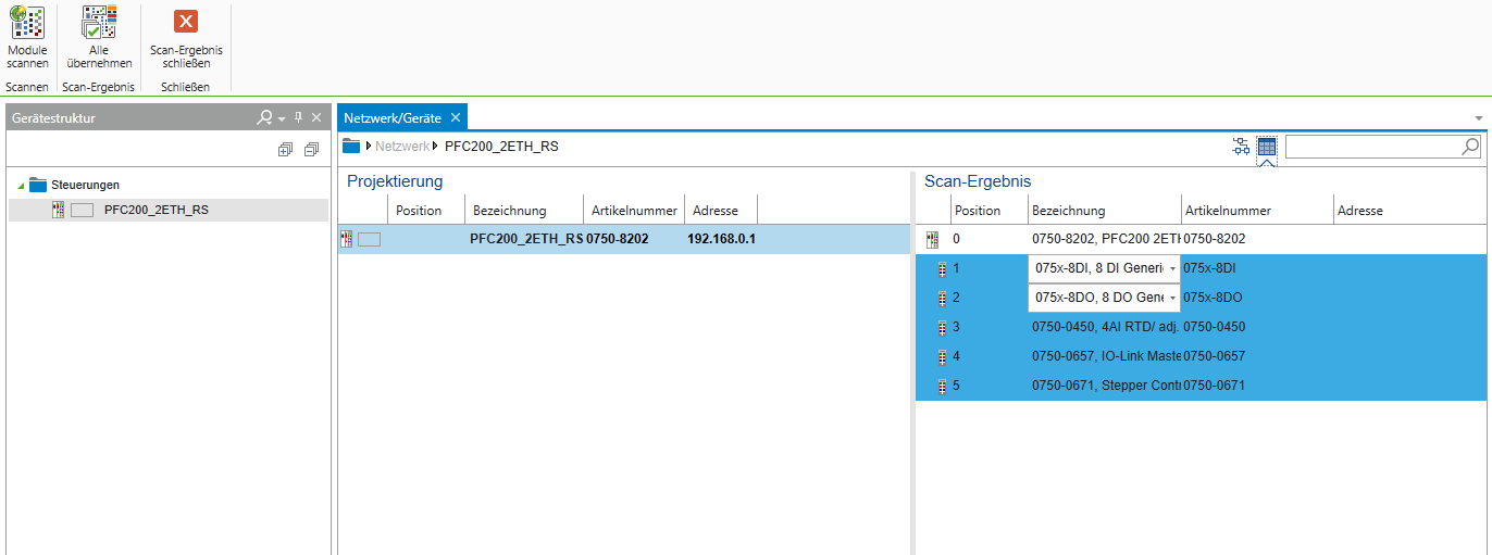 This has only added the PLC module itself. But the PLC has other modules attached to it that were not yet scanned for. Every module adds new functionality to the PLC. For example, module 750-430 is an 8-channel digital input card. Meaning that the wire-plugs on the 750-430 accept digital sensors like an inductive sensor, light beam sensor, etc.