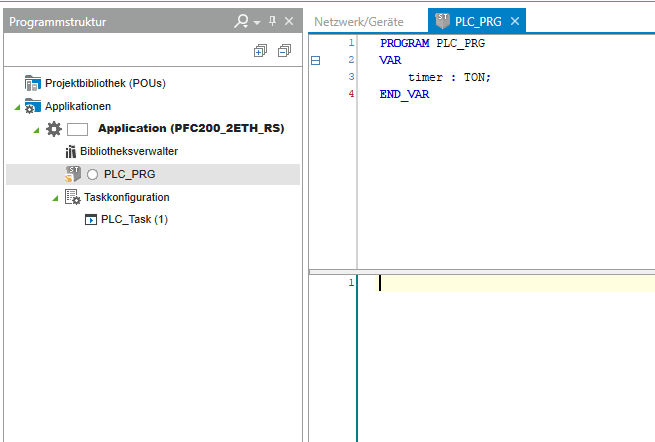 change to the PLC_PRG. This is the main program that will be excecuted. Here you define variables and your code!