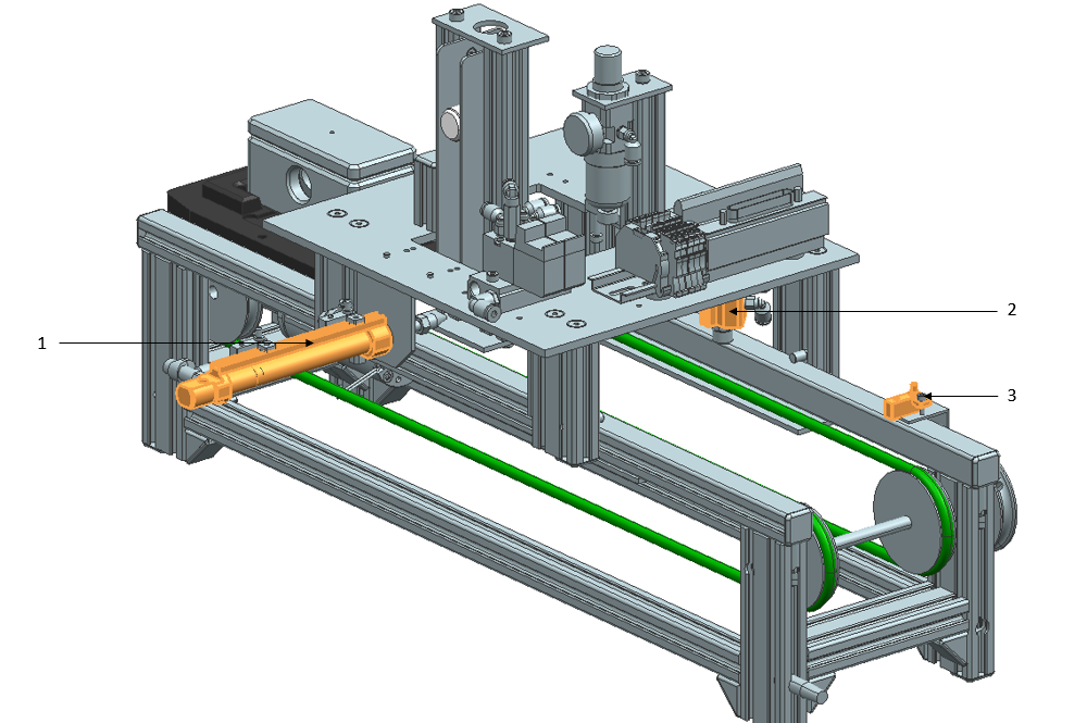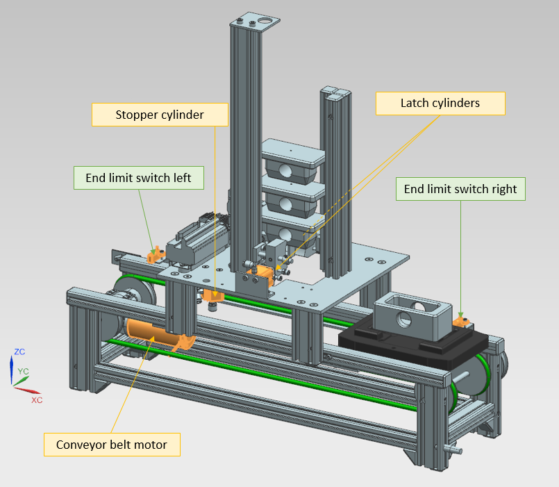 The purpose of the IMS3 station is to mount the base part on the workpiece carrier. The station has a few sensors and actuators, shown in the following figure.