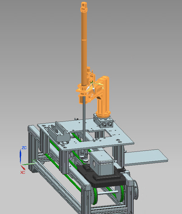 The entire arm rotates to bring the end-product to the specified platform. Because all components of the arm undergo the same motion together at all times during the simulation, they should be defined as a unified rigid body.