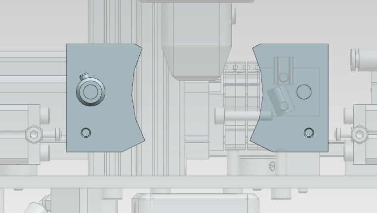 A pneumatic cylinder is used to push the bolt into the other pieces. Another cylinder is used as a stopper for the workpiece carrier.